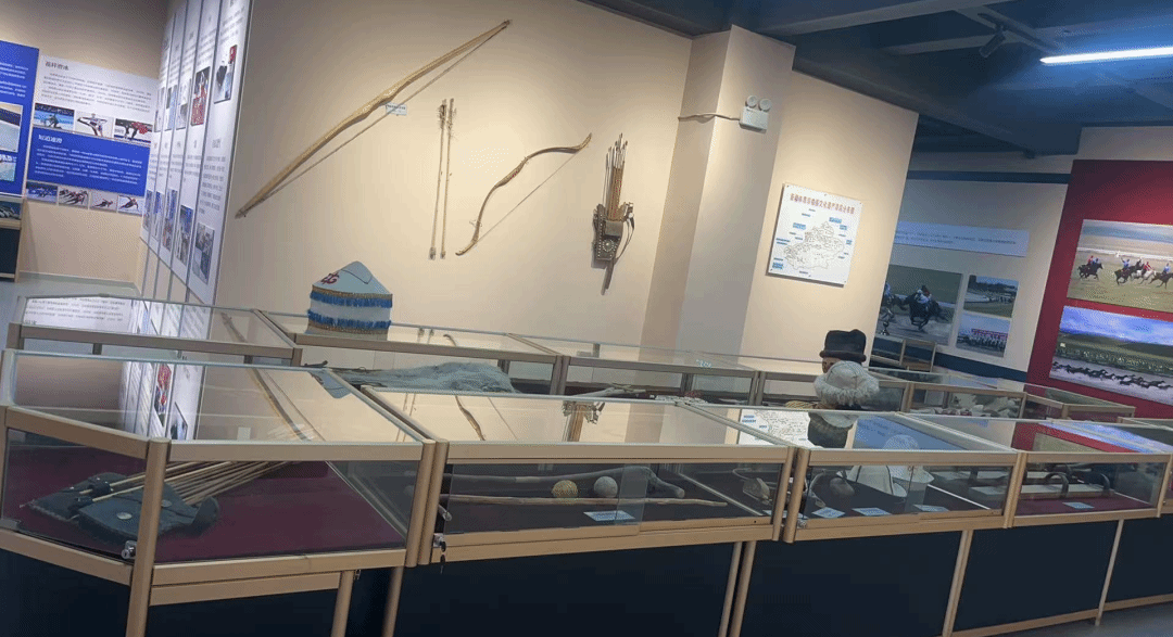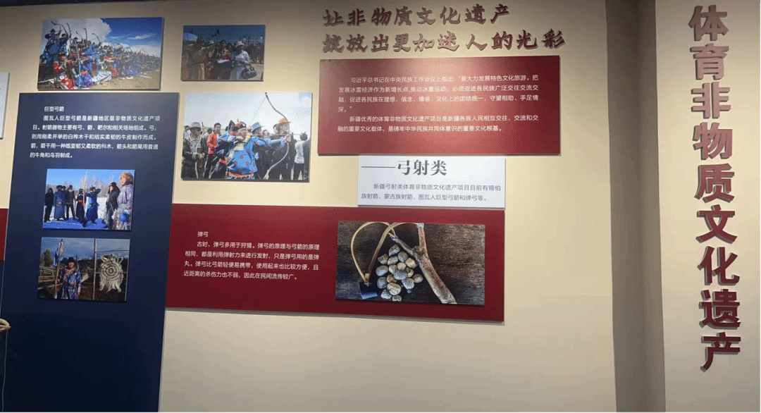 体育非物质文化遗产展厅如同一个鲜活的“体育文化宝库”,将新疆各民族世代相传的体育智慧与精神尽数呈现,弓射类、表演类、摔跤类、马术类、棋艺类、中华武术等六大核心板块各具特色、底蕴深厚,展现了体育非物质文化遗产的独特魅力。
