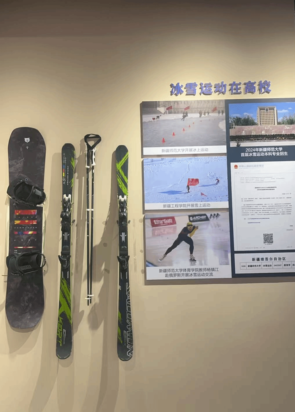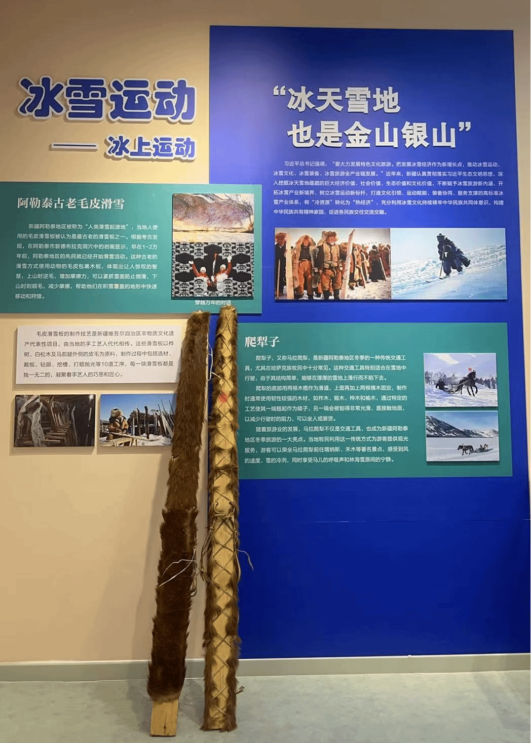 冰雪运动展厅宛如一部立体的“冰雪运动画卷”,陈列的古老毛皮滑雪板、原始冰鞋、爬犁子、冰陀螺等,见证着新疆作为中国冰雪运动发源地之一的悠久历史,呈现了从传统冰上嬉戏、民间雪上竞技,到现代冰球、速滑、花样滑冰等冰上运动,以及高山滑雪、越野滑雪、单板滑雪等雪上运动在新疆的普及发展。